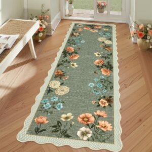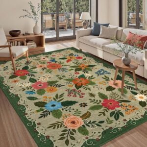 LocalStock Floral Scalloped Living Room Rug, 5×7 Area Rugs Ultra-Thin Soft Washable Rug, Non-Slip Rugs for Bedroom Stain Resistant Boho Low-Pile Throw Carpet for Dining Room Playroom Nursery, Green
