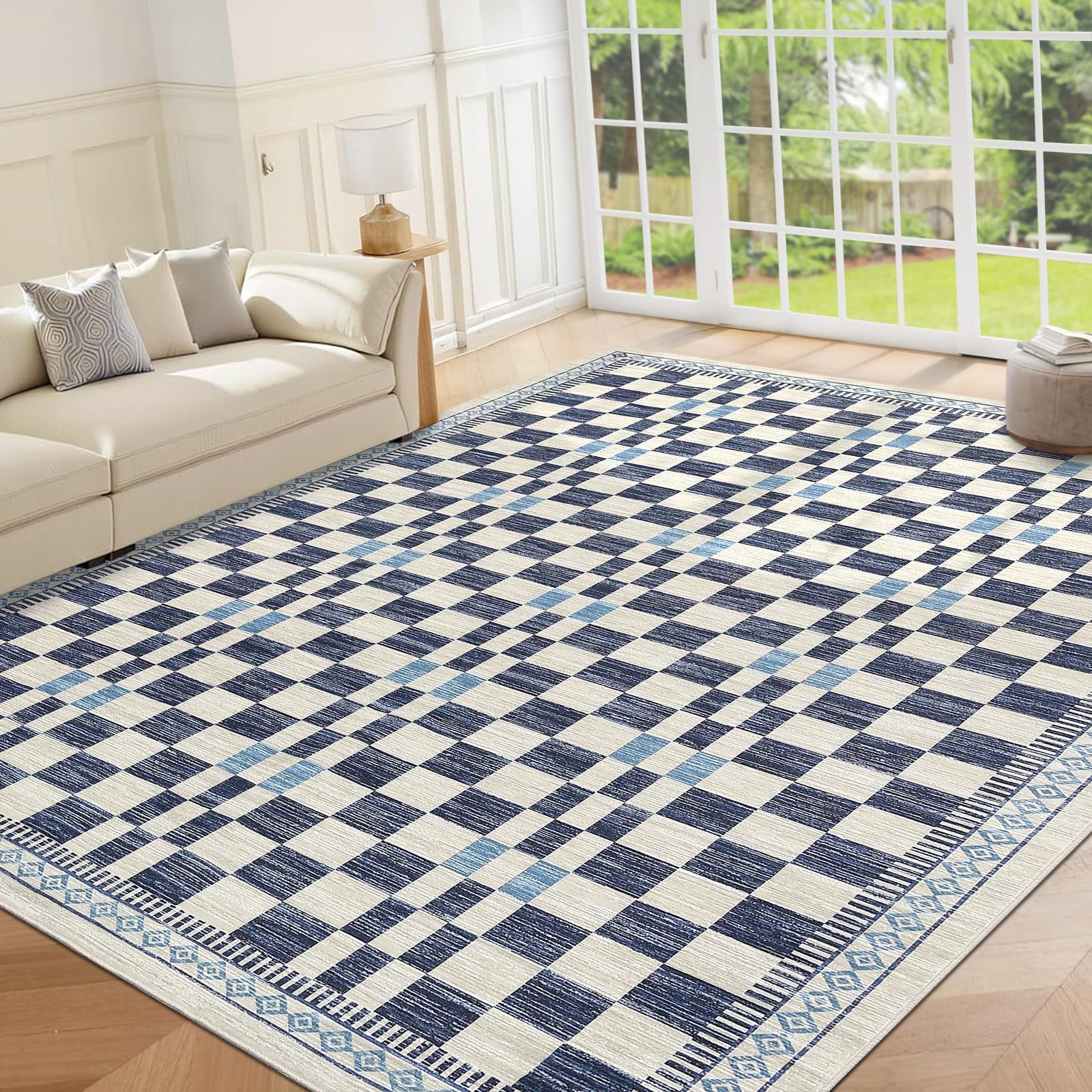 + Free Shipping· Modern Checkered Design: Featuring a stylish plaid pattern, this washable rug adds a contemporary touch to any living space, perfectly complementing modern decor styles.