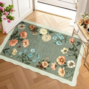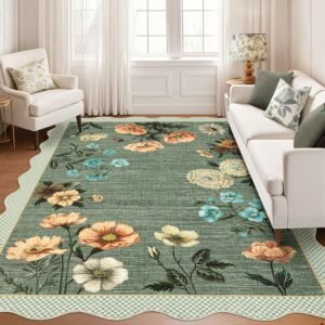 LocalStock Floral Scalloped Living Room Rug, 5×7 Area Rugs Ultra-Thin Soft Washable Rug, Non-Slip Rugs for Bedroom Stain Resistant Boho Low-Pile Throw Carpet for Dining Room Playroom Nursery, Green