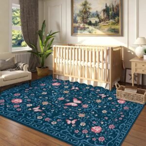 LocalStock Washable Floral Area Rug 5×7 for Living Room Non Slip Bedroom Rug Soft Stain Resistant Large Dining Room Throw Carpet Low Pile Black Bow Rugs Butterfly Flower Carpet for Nursery Entry, 5×7