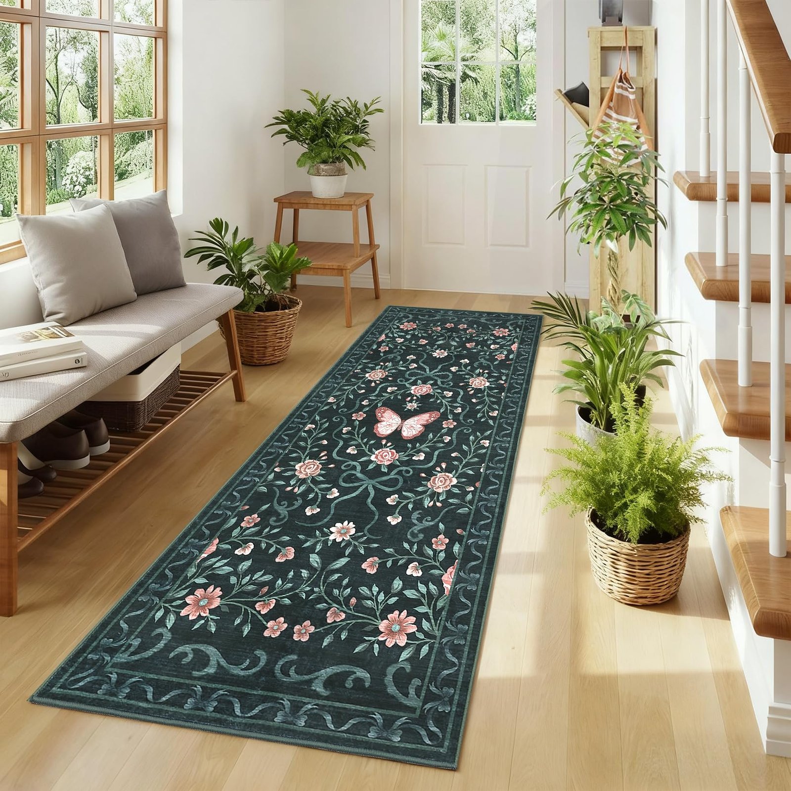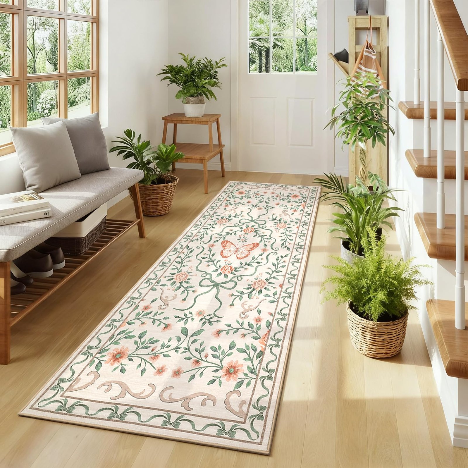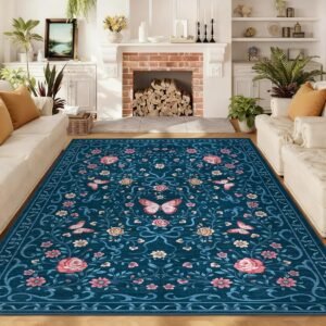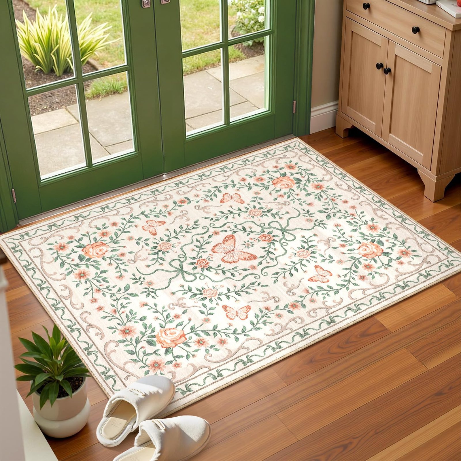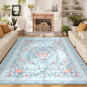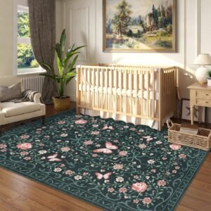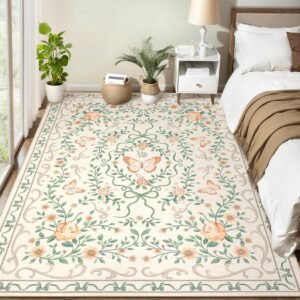 · 【Charming Floral & Butterfly Design】Adorned with delicate flowers, graceful butterflies, and intricate green vines, this rug brings a vibrant yet elegant natural charm to your space. The harmonious color tones of pink, green, and beige seamlessly complement any home decor, adding a touch of timeless beauty to your living room, bedroom, or entryway