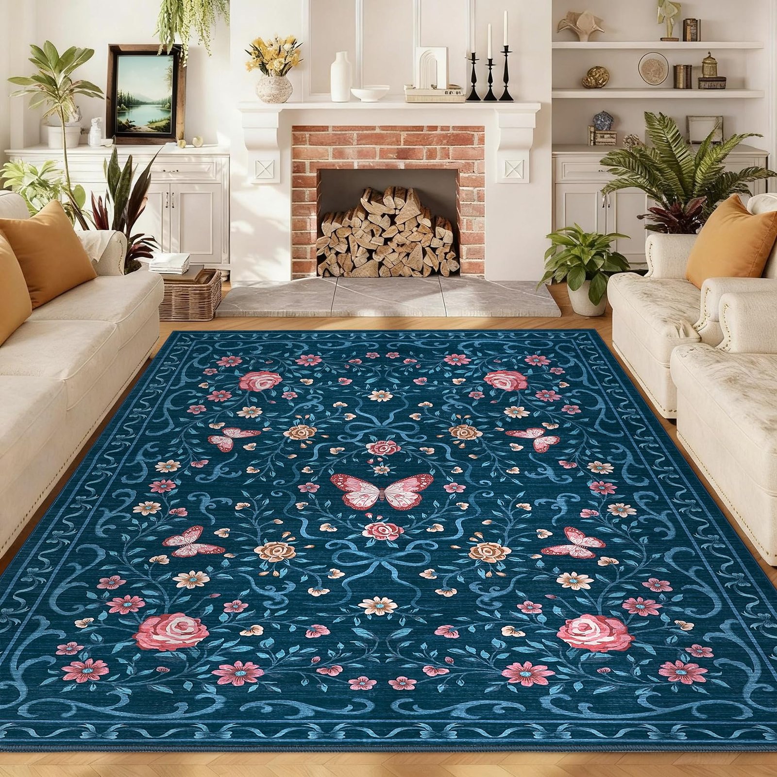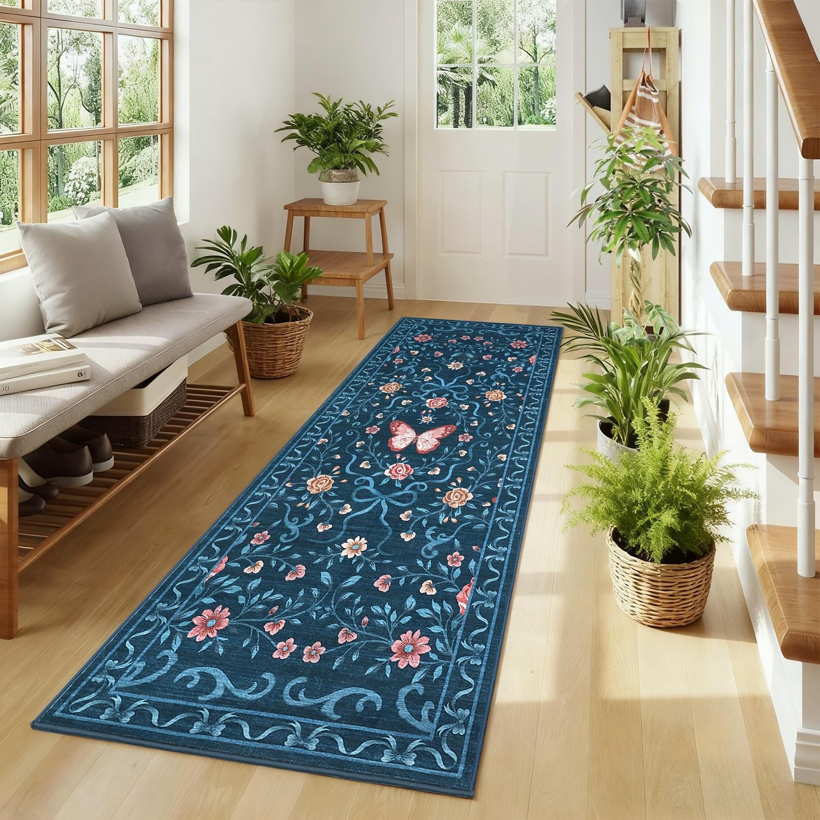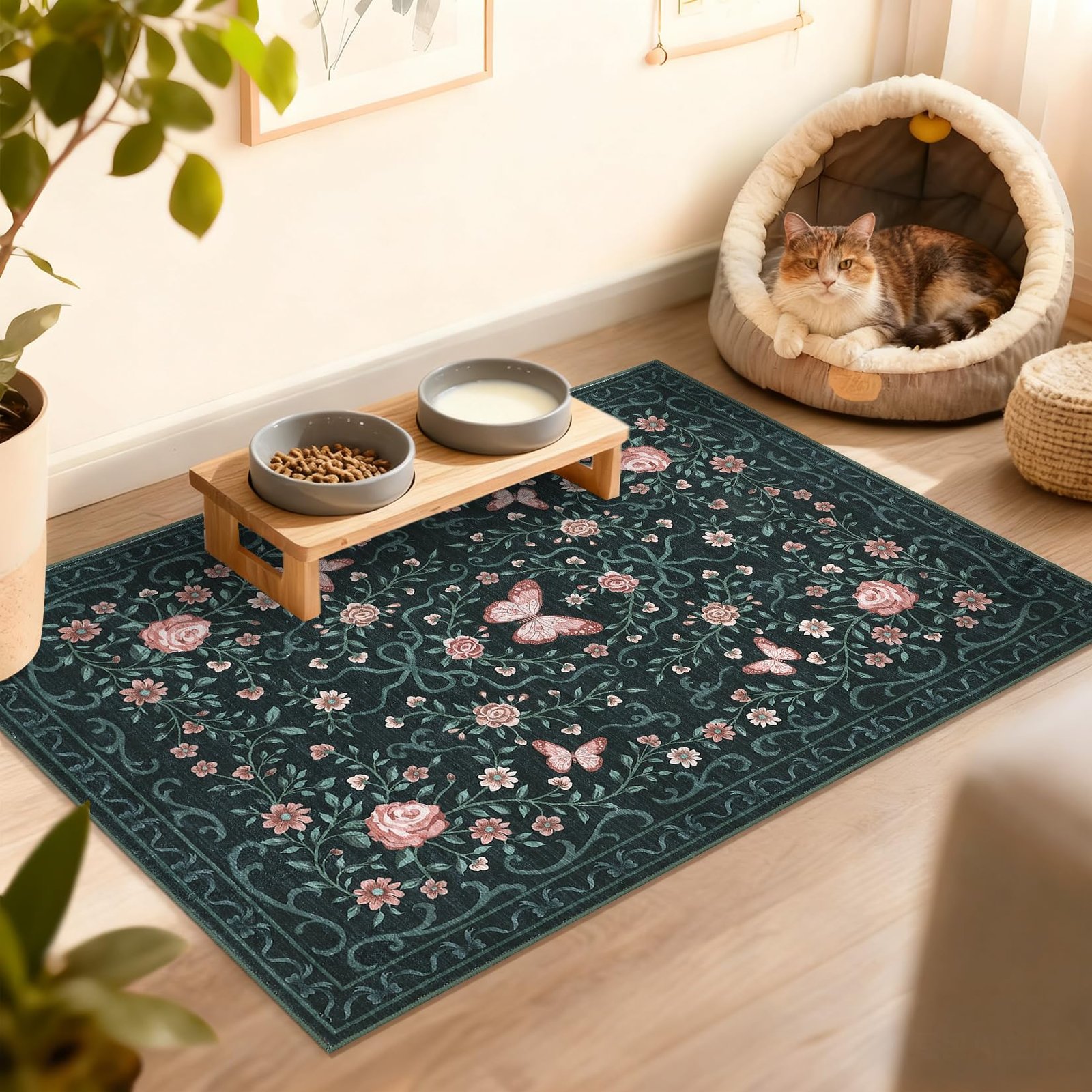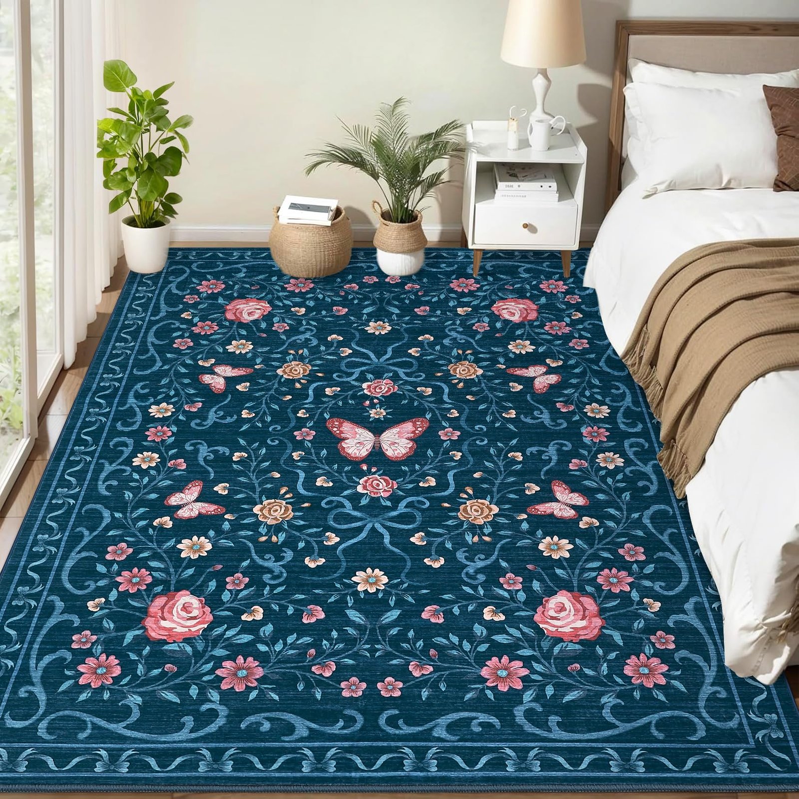 · 【Charming Floral & Butterfly Design】Adorned with delicate flowers, graceful butterflies, and intricate green vines, this rug brings a vibrant yet elegant natural charm to your space. The harmonious color tones of pink, green, and beige seamlessly complement any home decor, adding a touch of timeless beauty to your living room, bedroom, or entryway